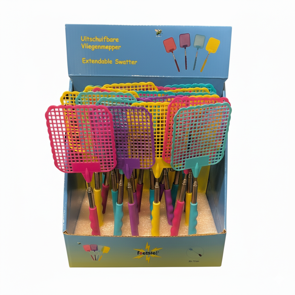 Uitschuifbare vliegenmeppers in verschillende kleuren. Tot wel 70+cm lang! 24 stuks in een display. Deze Foetsie vliegenmeppers zijn compact en doeltreffend tegelijk!