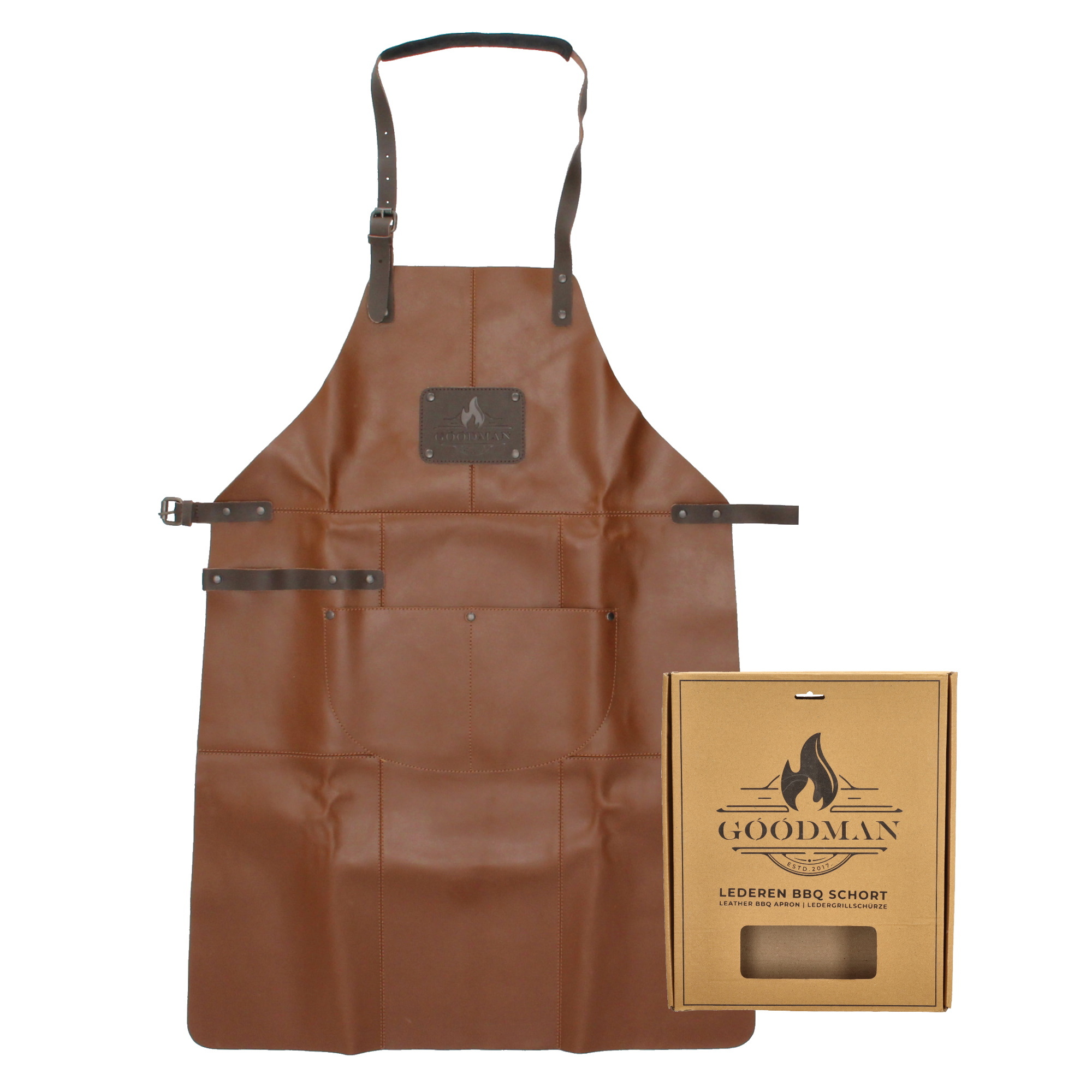 Voor extra gebruiksgemak is het schort uitgerust met een comfortabele stoffen verdikking in de nek en twee praktische steekvakken aan de voorkant, perfect voor het opbergen van handschoenen of een doek. Daarnaast is er een leren bandje aan de achterkant waarmee spatels of tangen kunnen worden opgehangen, zodat je altijd de benodigde tools binnen handbereik hebt.