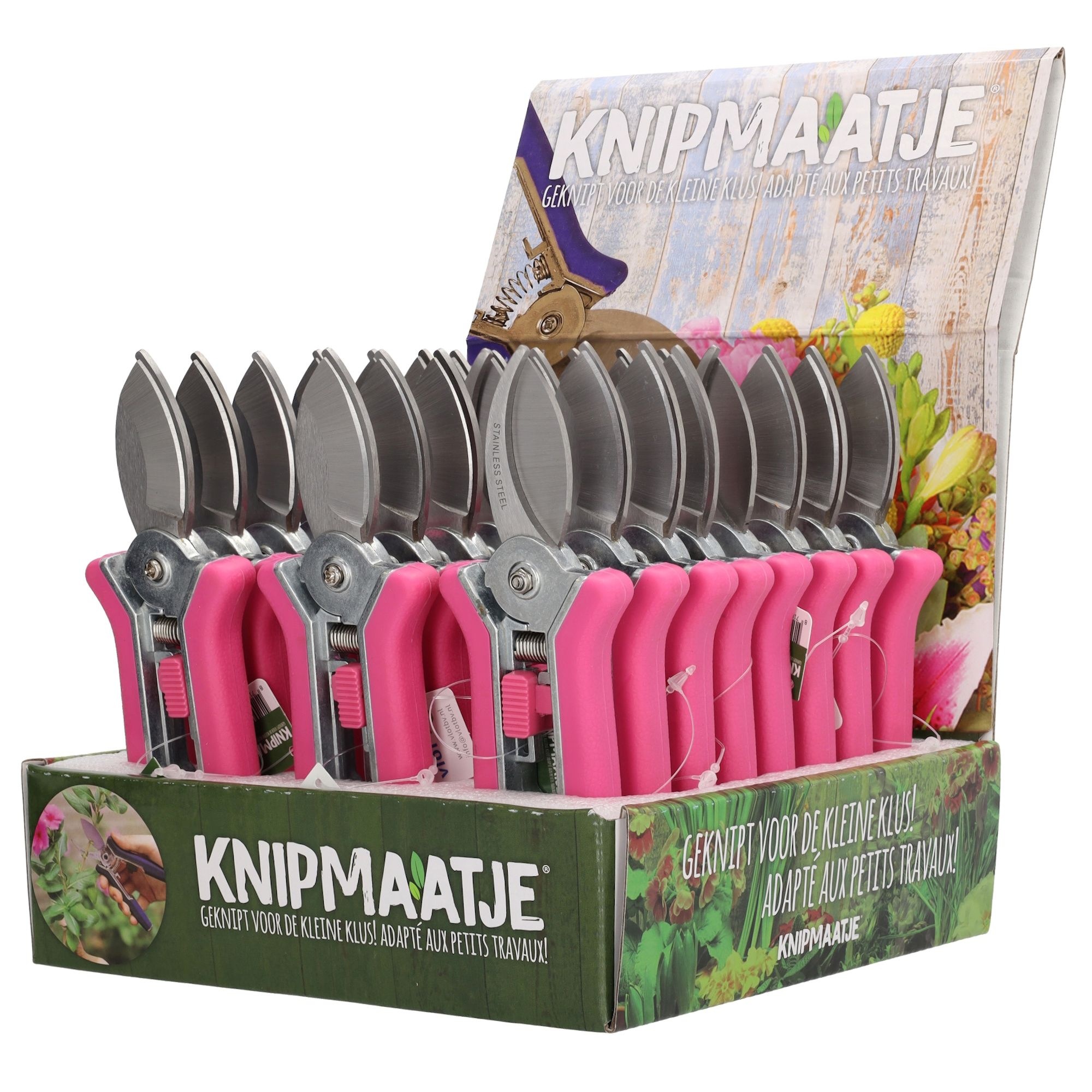 Knipmaatje is een handig snoeischaartje en ideaal om te gebruiken voor de kleinere snoeiwerkzaamheden. Denk hierbij aan het knippen van bloemen, planten, kruiden of kleine takjes. Te gebruiken door zowel links- als rechtshandigen. De bladen bestaan uit rvs en de handvaten hebben een laag van zacht rubber voor goede grip. Een Knipmaatje is 15 cm lang en ongeveer 4,5 centimeter breed.