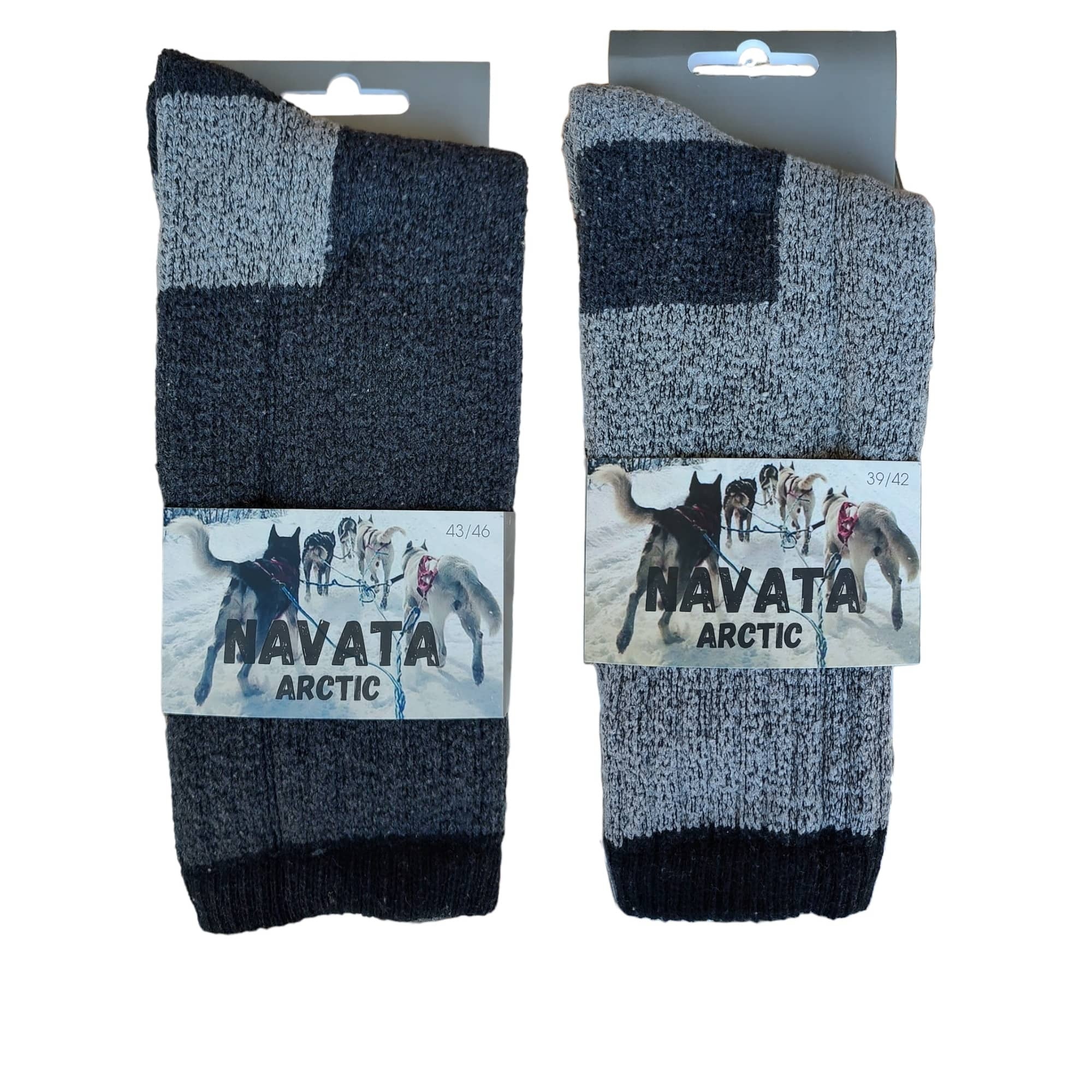 Warme gewatteerde comfortsokken van Navata, in een assorti van 2 kleuren: zwart/grijs en grijs/zwart. Samenstelling materialen: 50% wol, 45% polyamide en 5% elastaan.