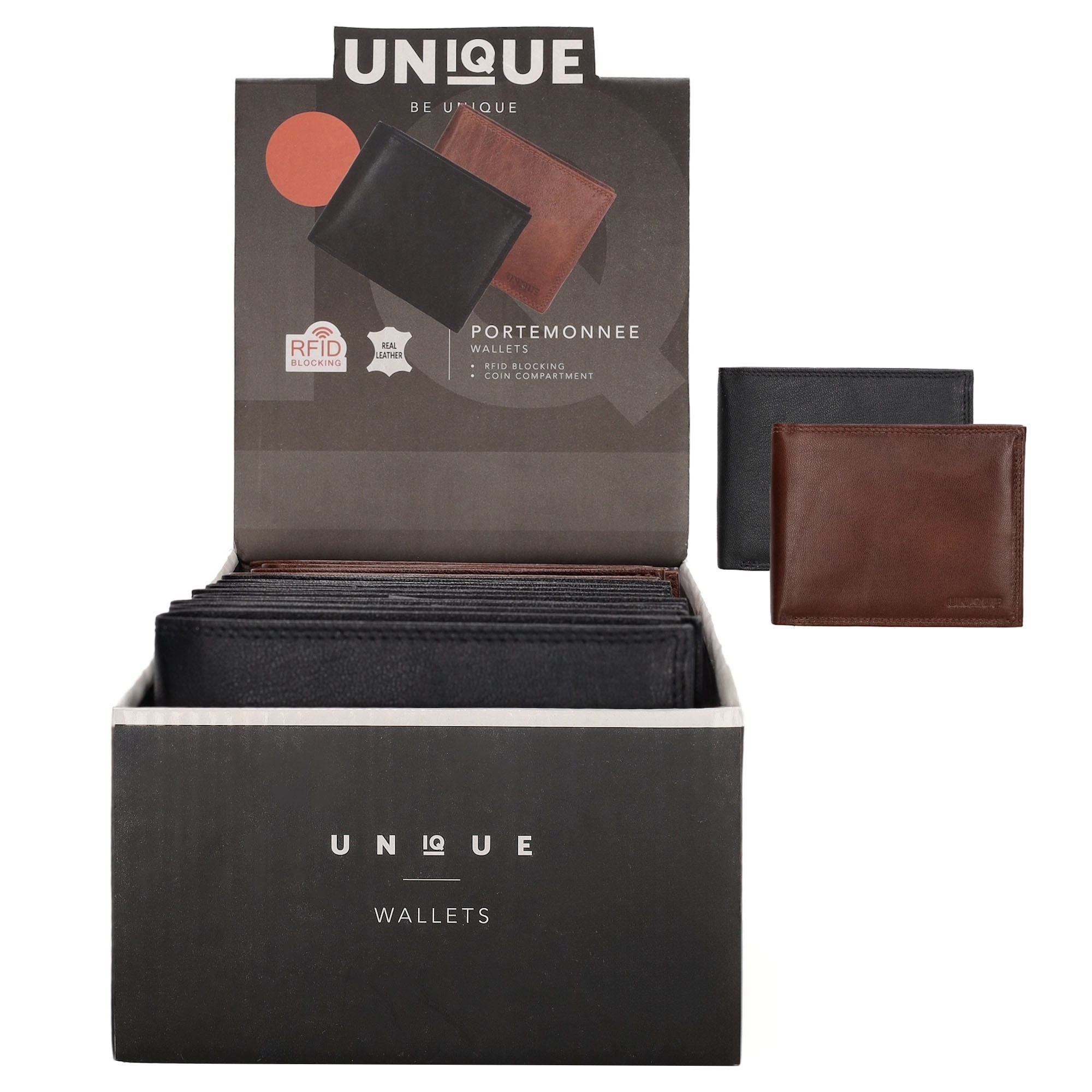 Toonbankdisplay met stijlvolle herenportemonnees in twee klassieke kleuren: zwart en bruin. De display bevat in totaal 12 stuks, gelijk verdeeld over de twee kleuren.