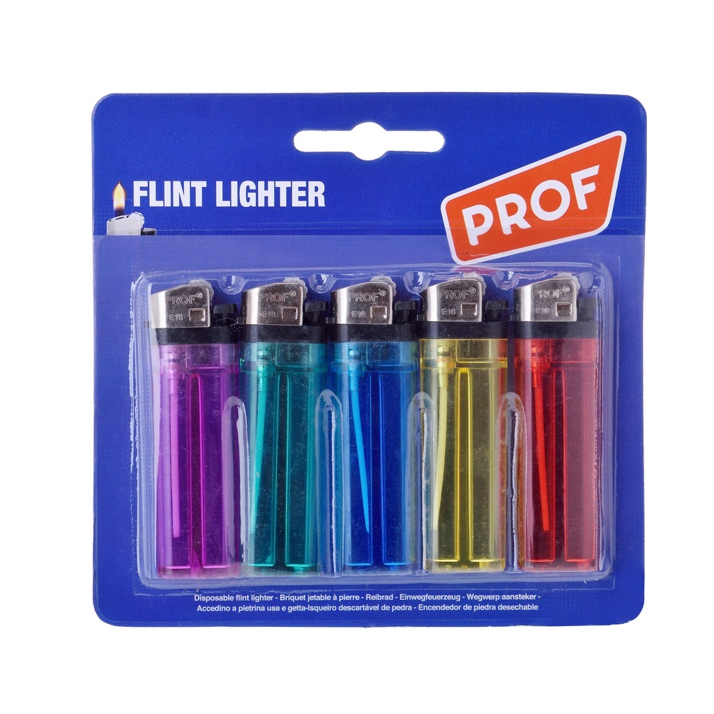Verpakking met vijf aanstekers in verschillende kleuren. Deze basic aanstekers zijn makkelijk in gebruik. Eenmalig te gebruiken. Met verstelbare vlam.
