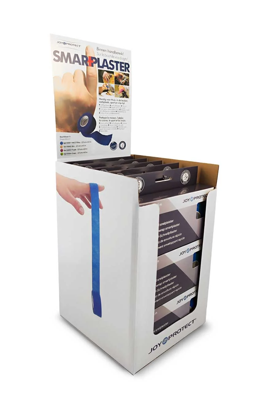 Afscheurbare, zelfhechtende pleister. Blijft zitten op vochtige en vettige huid. Luchtdoorlatend en waterafstotend. Dermatologisch getest en latex vrij. Een display bevat 15 boxen, een box bevat 2 rollen in de kleur blauw.
