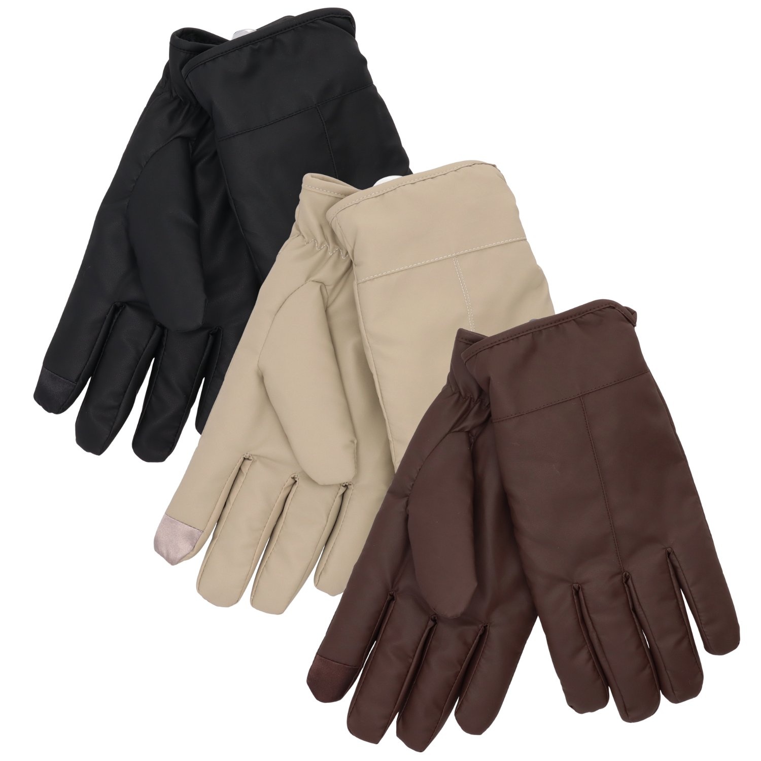 Functionele en comfortabele herenhandschoenen met warme fluffy voering. Dankzij de speciale touch compitabele vingertop zijn ze geschikt voor het bedienen van smartphones en tablets. Verkrijgbaar in de kleuren zwart, zand en donkerbruin, en in de maten S/M, L en XL.