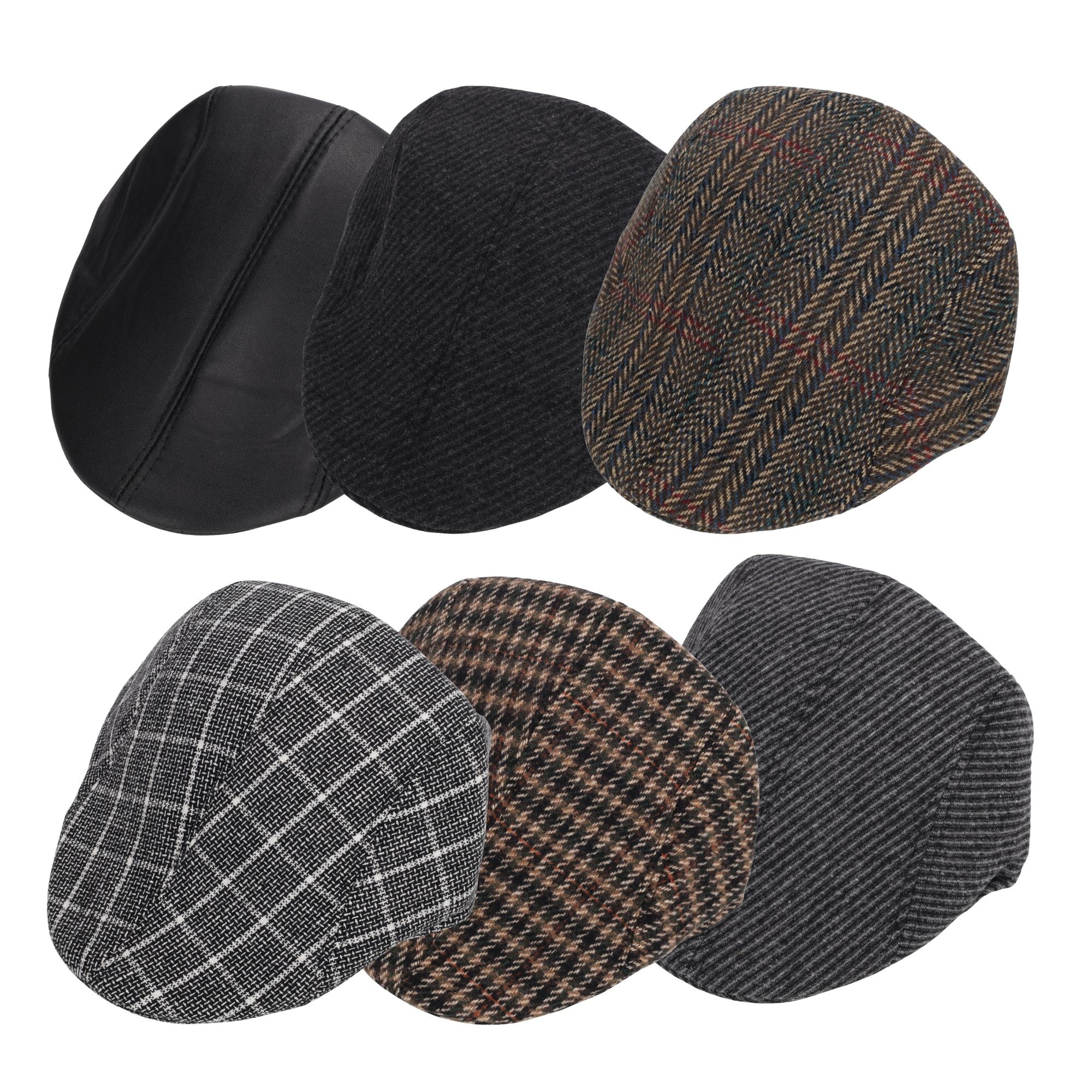 Klassieke flatcaps in diverse dessins en materialen. Deze mix bestaat uit 12 petten in verschillende kleuren en patronen, waaronder ruit, visgraat en effen uitvoeringen.