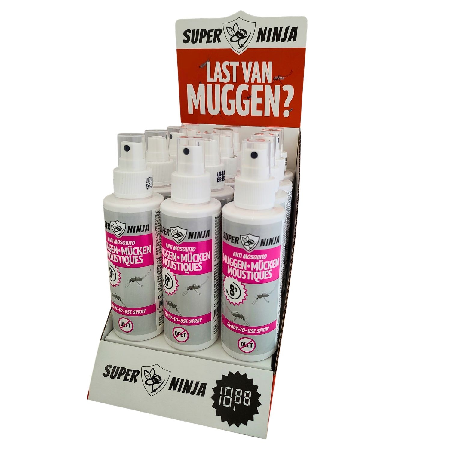 Super Ninja anti-muggenspray 12 stuks inclusief gratis toonbankdisplay.