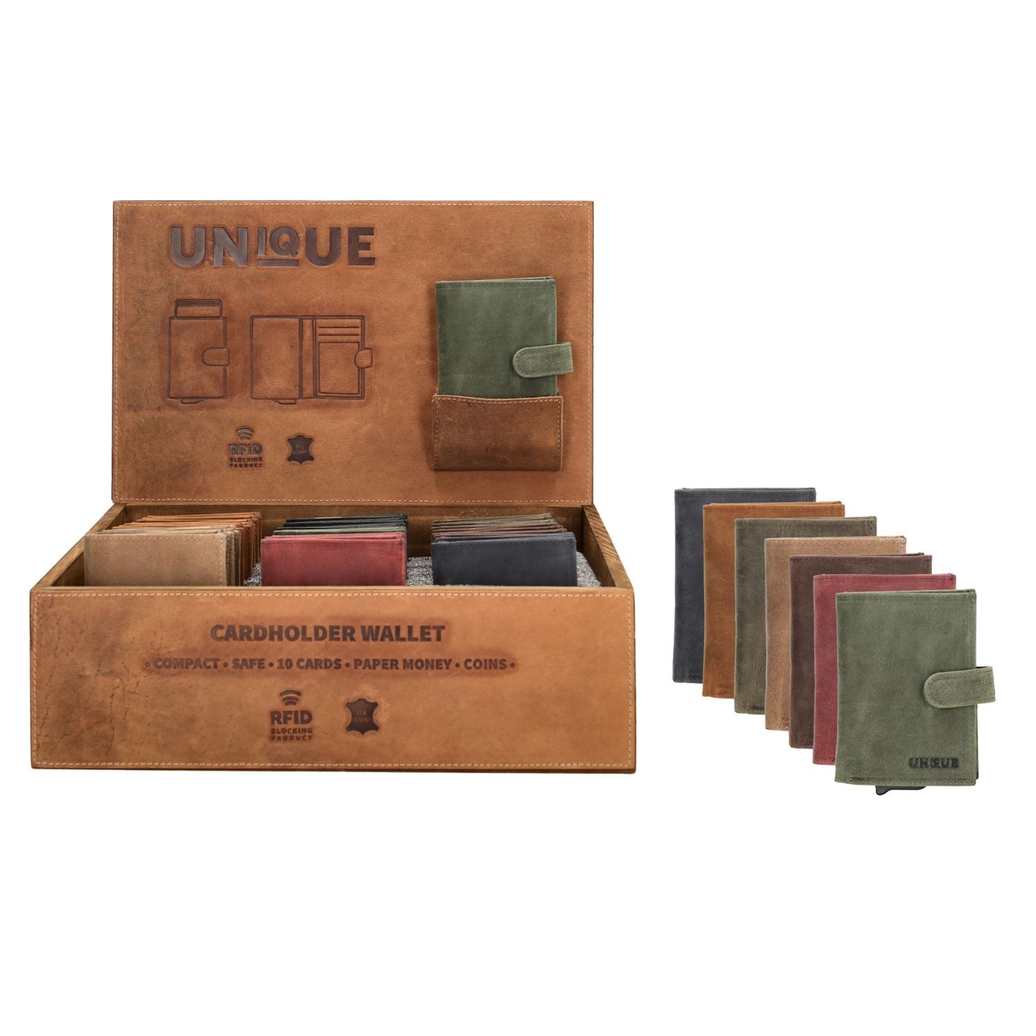 Creditcardhouders van echt leer. In verschillende kleuren, zoals bruin, groen en rood. Met RIFD technologie.